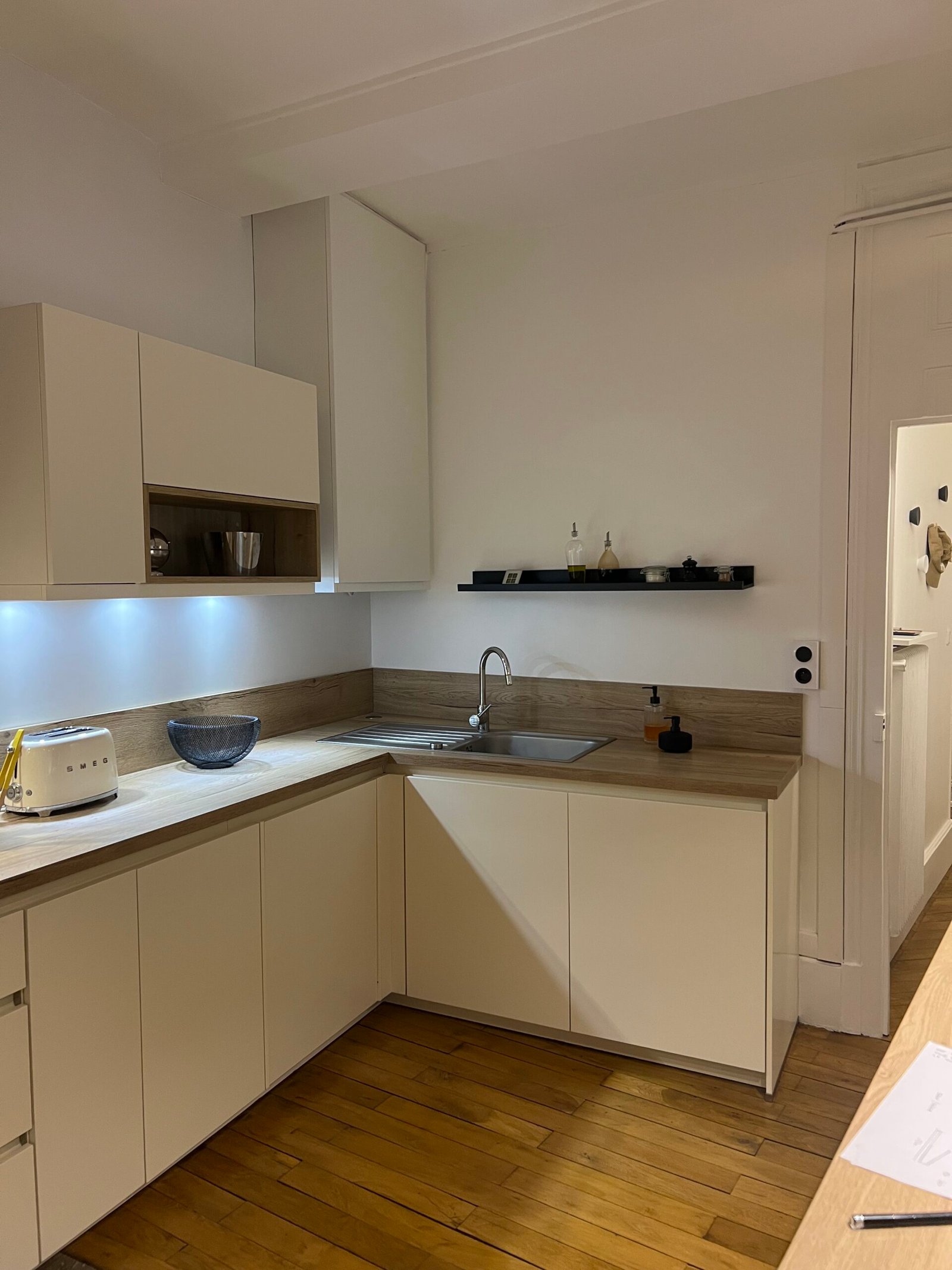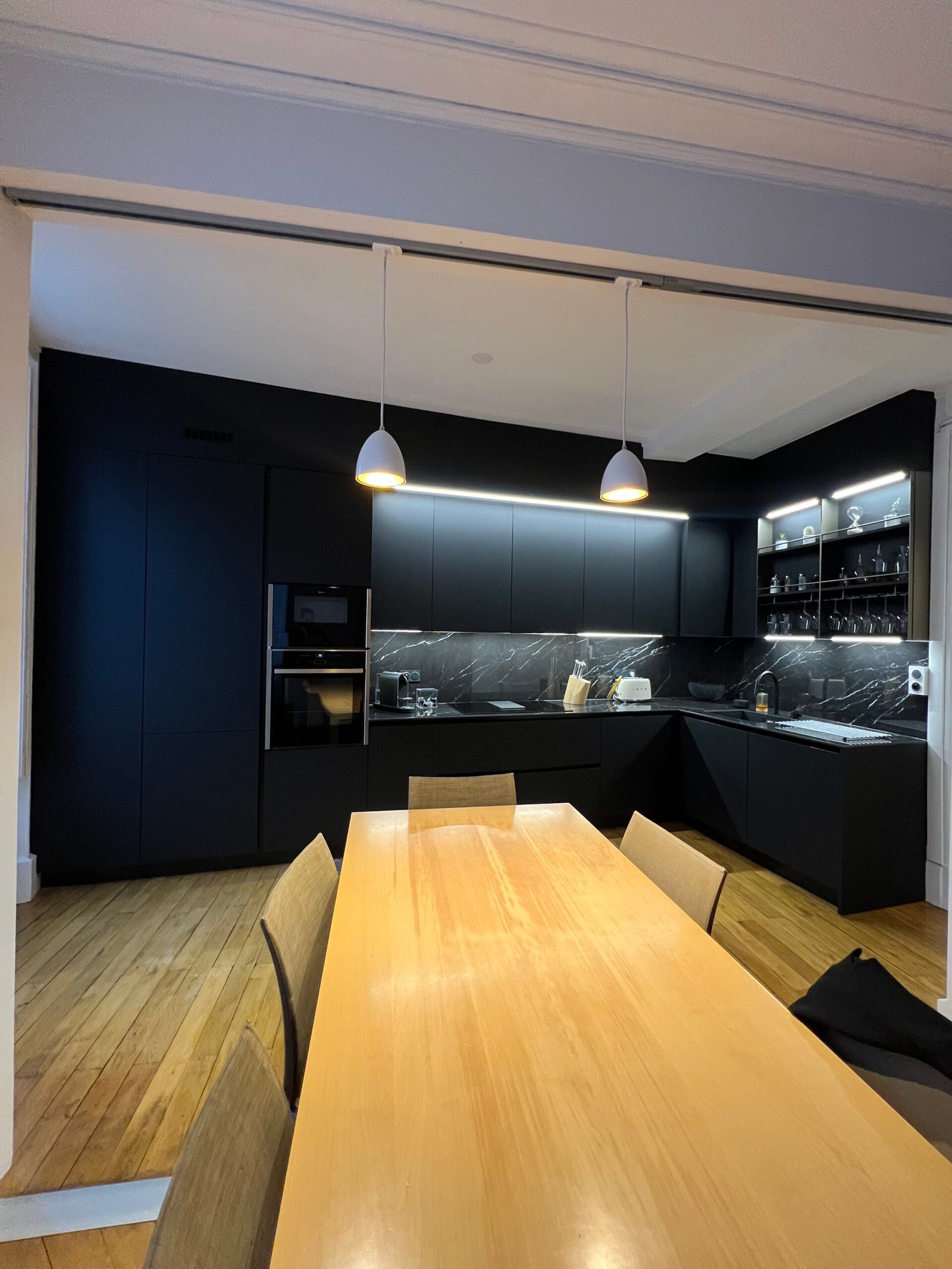 Choix de façade full black pure laque pour un effet anti trace en gardant la profondeur de laque pour un rendu exceptionnel malgré l’aspect foncé , mélanger à un plan de travail en céramique brillant pour jouer avec les éclairage de la cuisine . Petit détail sur la composition mural pour rangement verre afin d’épuré la partie droite et d’avoir un rendu très haut de gamme sans en faire trop